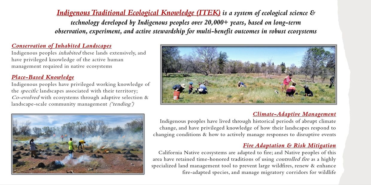 This program aims to re-introduce the critical human element of Indigenous knowledge and tending of Northern California ecosystems that has been missing since colonization in 1850. Northern California has been a poster child for climate change-related impacts in recent years, as record-breaking wildfires and droughts have destroyed whole towns and devastated forests in our area (Camp and Carr Fires in 2018, North Complex Fire in 2020, Dixie Fire in 2021, and many others). The severity of these dramatic impacts have a basis in the removal of human stewardship from native ecosystems over nearly two centuries through the genocide of Indigenous peoples and the outlawing of Native cultural practices, including controlled (cultural) fire to renew fire-adapted native plants and mitigate the size and severity of wildfires.